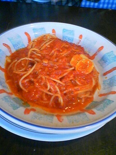 左 トマトとニンニクのスパゲティ、管理人が必ず注文するお勧めのスパゲティです。