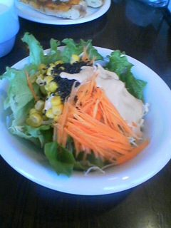 左 豊富な種類のサラダ、ドレッシングも多彩。