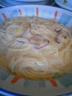 右 カルボナーラ、濃厚でクリーミーなソースが美味しさの秘密。